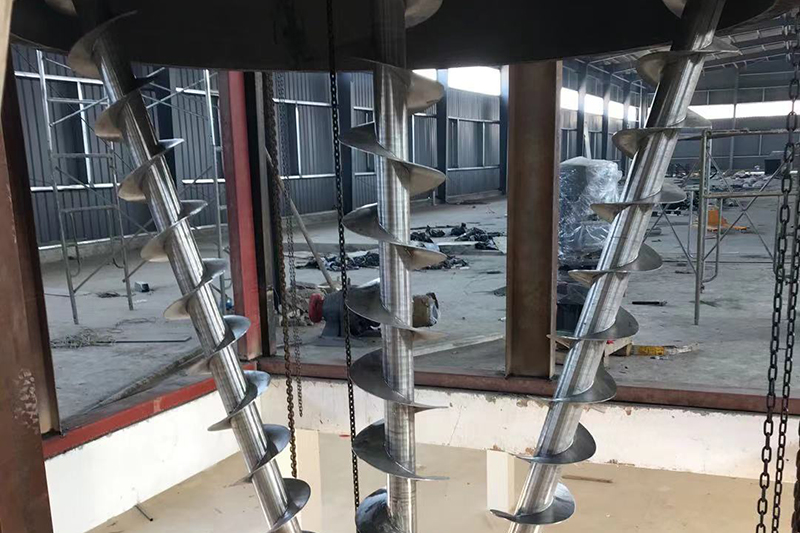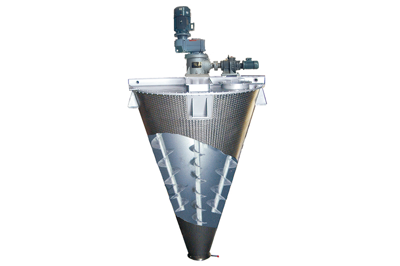 混合机三条螺旋(二条对称排列螺旋及中间一条长螺旋)的快速自转,将物料向上提升,形成三股沿筒壁自下向上的螺柱形物料流,长螺旋运转解决了中间物料混合的盲区及底部死角,